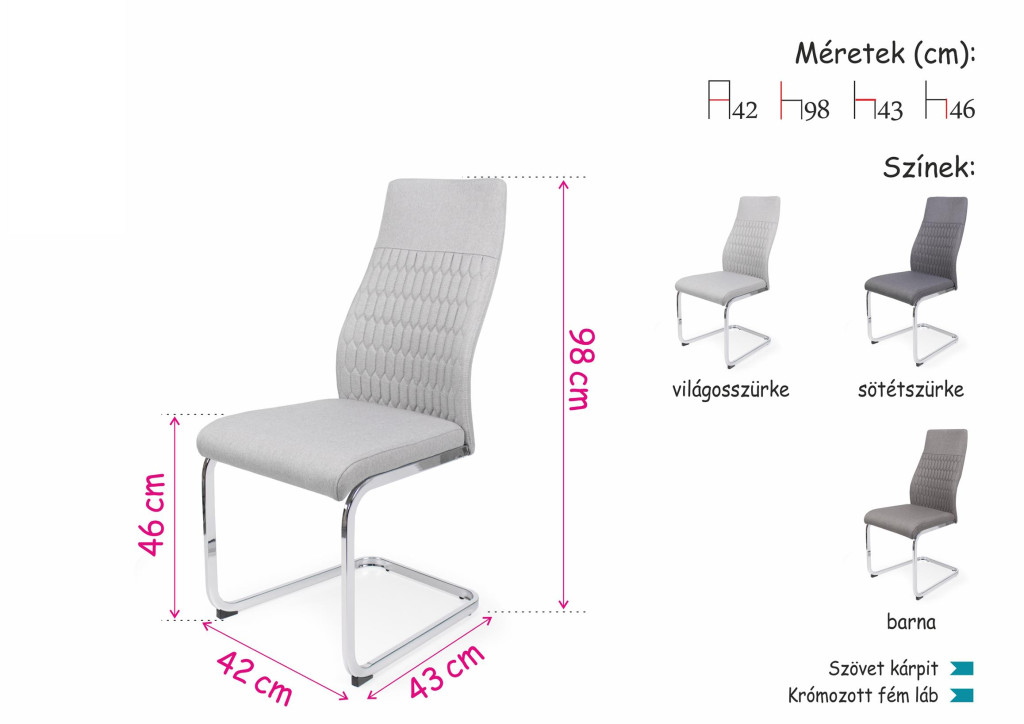 Bolton étkezőszék több színben rendelhető: barna, világosszürke, sötétszürke szövet kárpitozással, króm fém lábbal.