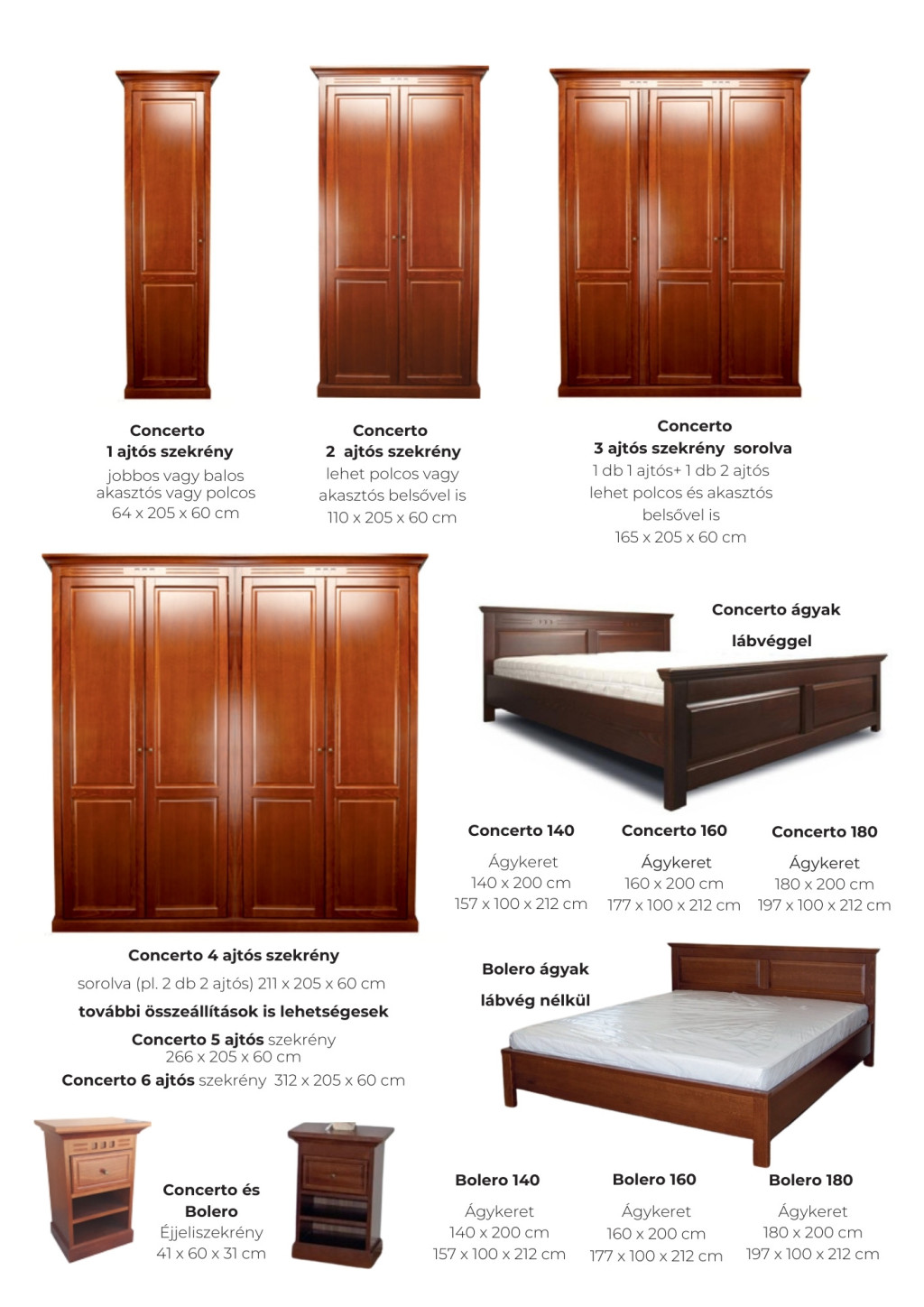 A Concerto bútorok megbízható, minőségi magyar termékek, melyeket szakértő kezek gondos munkája és valódi alapanyagok tesznek különlegessé. A szekrények többféle pác színben rendelhetők, így Ön tökéletesen összehangolhatja őket otthona hangulatával.