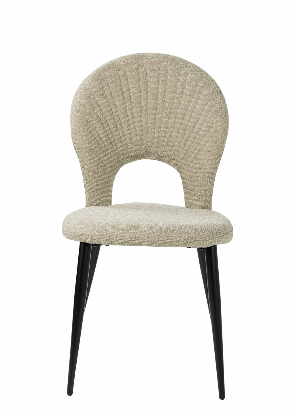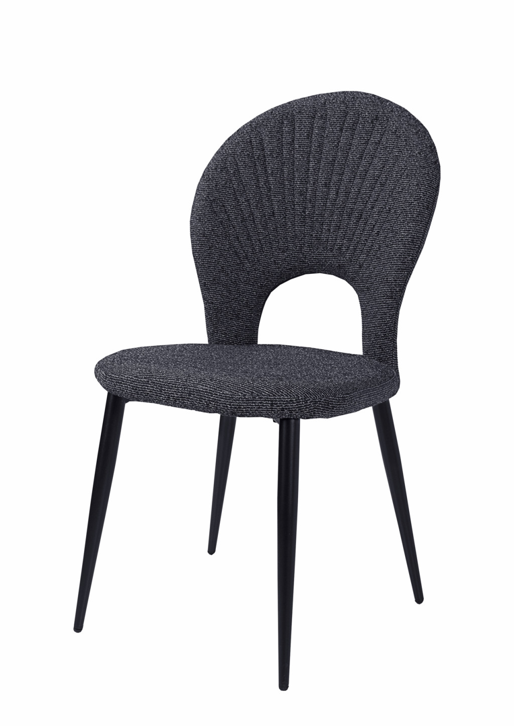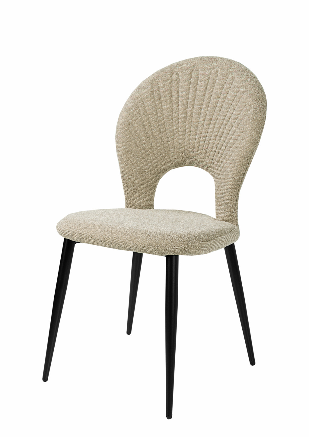 Különleges kagyló forma háttámla, szövet kárpitozással, porszórt fekete fém lábakkal.