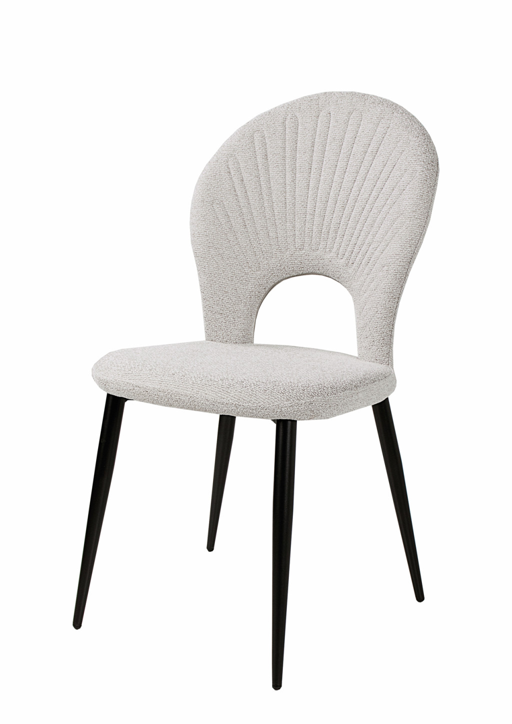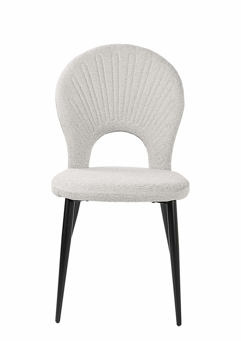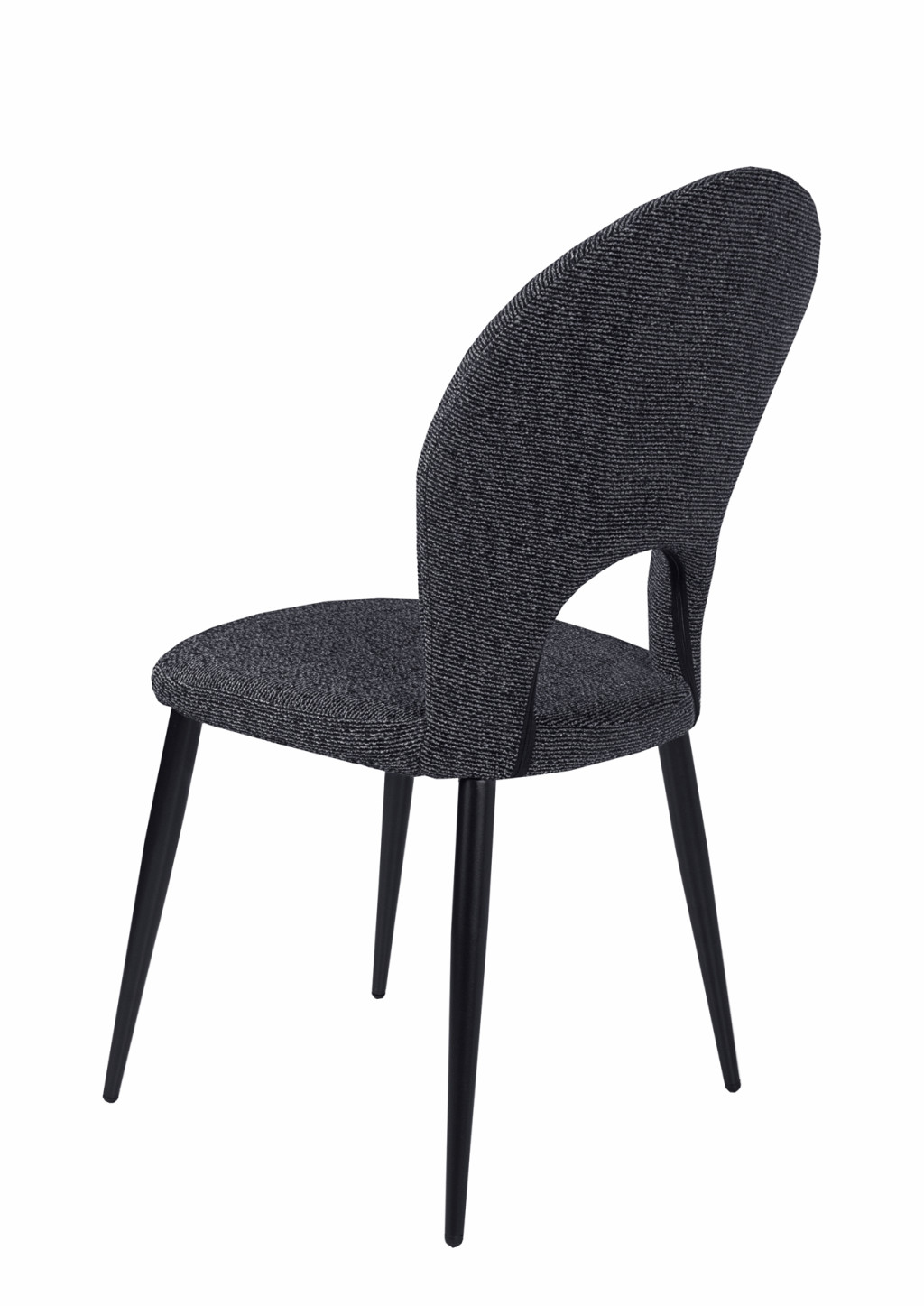 Különleges kagyló forma háttámla, szövet kárpitozással, porszórt fekete fém lábakkal.