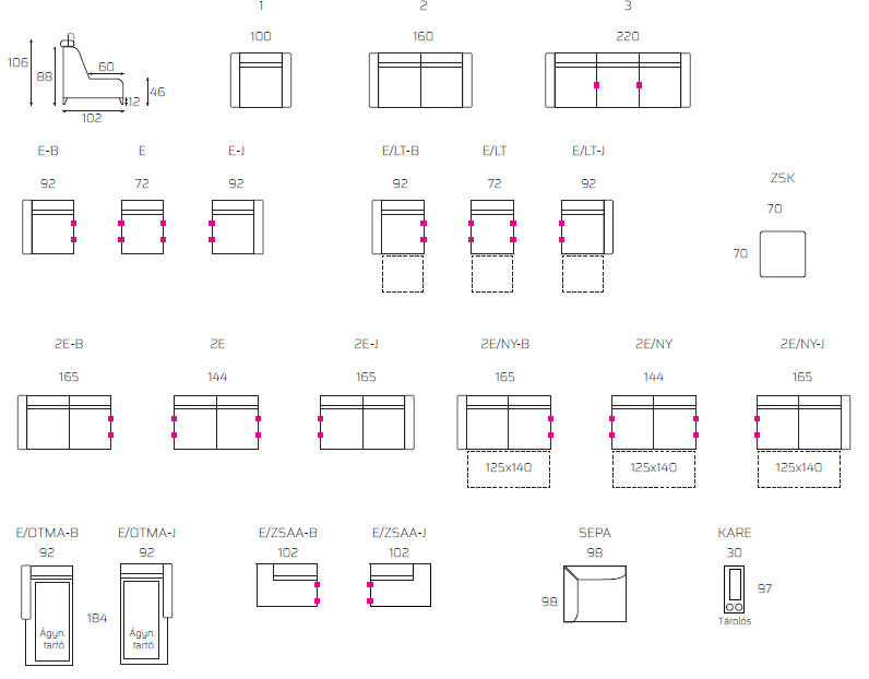 Sarok variációknak csak képzelete szab határt. Az 1 üléses elem lehet lábtartós vagy fix, 60 vagy 70 cm szélességben is rendelhető.